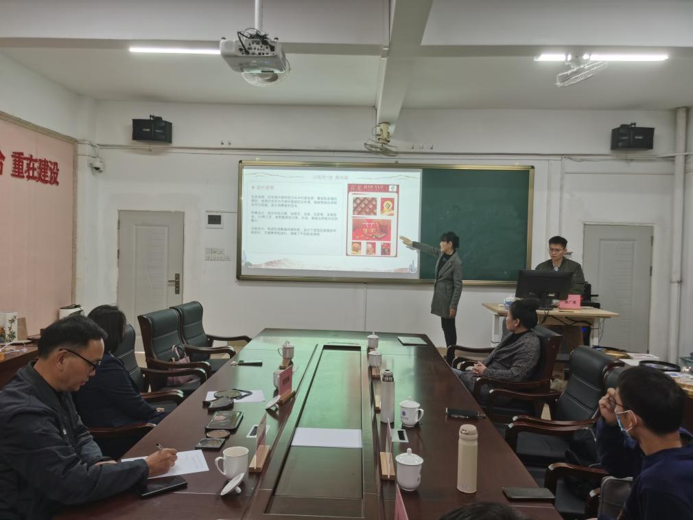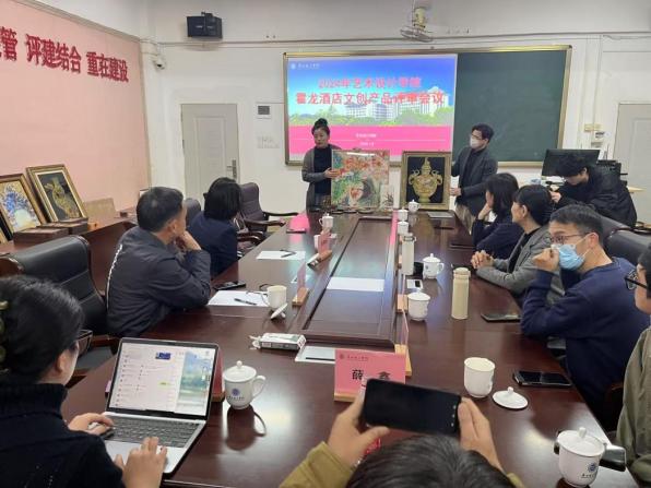会议第一个议程,尚华院长介绍了指导学生专门为霍龙酒店创作的包装设计作品,包括贺岁、端午、中秋等节庆包装;当地土特产包装、茶叶包装、礼品包装、文创纪念品包装等四十余款,作品风格各异,形式丰富,可以满足不同客户各类包装需求;刘莉莉和张双教师展示了学生创作的系列文创产品,包括装饰画、灯具、茶具等。作品风格多样,融入了非物质文化遗产掐丝珐琅彩、彩玻璃艺术等元素,充分体现了文化创新和实用美感兼具的设计理念。